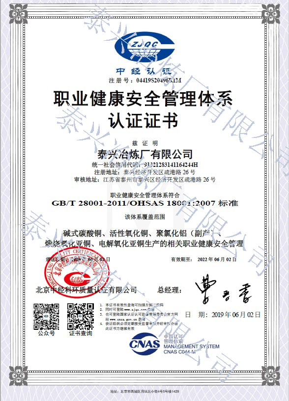 泰興冶煉廠有限公司(原泰興冶煉廠),始建于20世紀70年代初,現位于江蘇省泰興經濟開發區。歷經40年的創新驅動、穩健發展,已成長為一家專業生產堿式碳酸銅、高純電鍍氧化銅、氧化亞銅、氧化銅、無水硫酸銅、海綿銅粉及副產品聚氯化鋁(凈水劑)等系列無機鹽產品及處置不含氨的氯化銅蝕刻液(HW22)15000噸/年的“國家高新技術企業”和地方性骨干企業。公司總占地面積3.7萬平方米,建筑面積4萬平方米,注冊資本2088萬元,固定資產1.2億元,年產值約7億元。